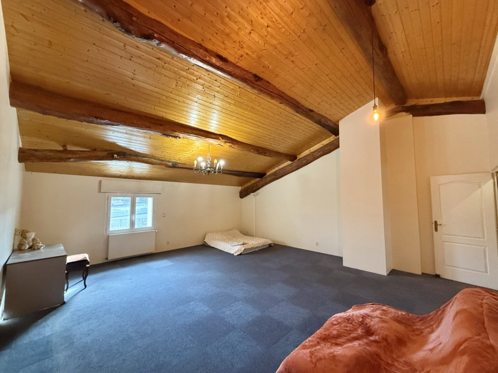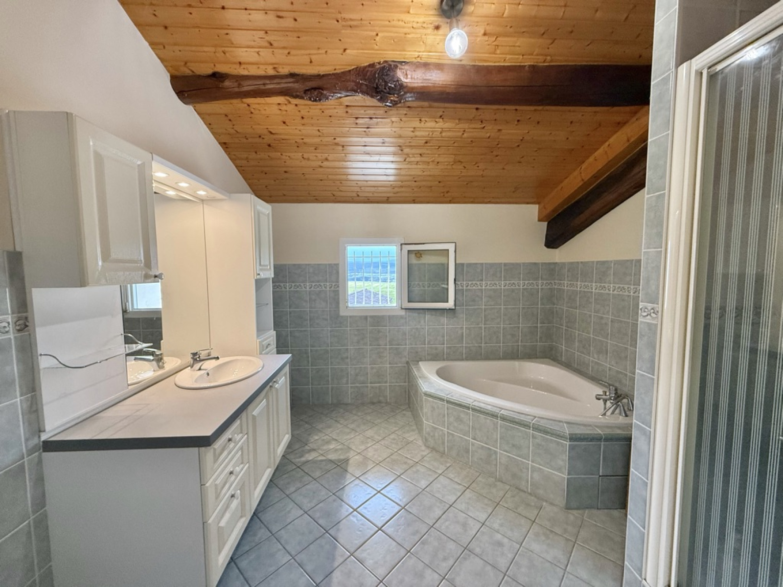 À l'étage, la maison dispose de quatre chambres, dont une suite parentale avec salle d’eau et WC privatifs, ainsi qu’une grande chambre d'environ 40m². Un WC indépendant et une salle de bain complètent l’étage.