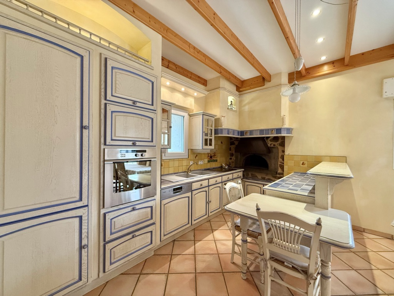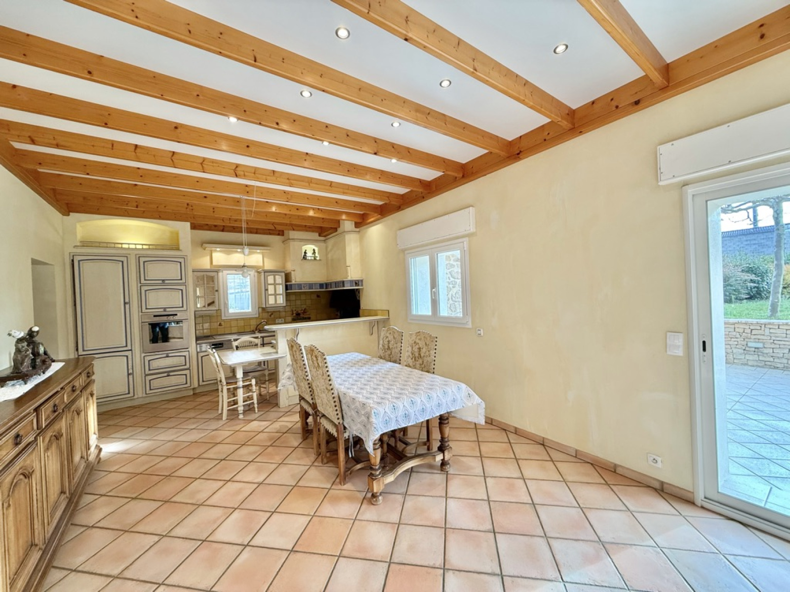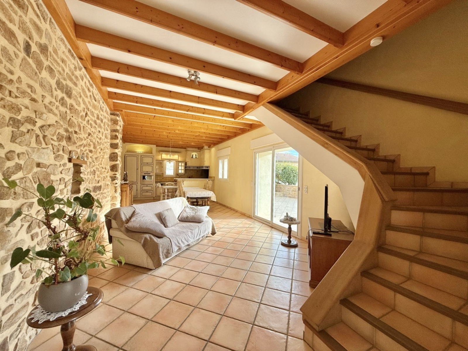 Le rez-de-chaussée se compose d'un salon/séjour spacieux d'environ 48m², lumineux grâce à une baie vitrée ouvrant sur un cadre verdoyant. Les murs en pierre ajoutent un véritable cachet à cet espace. La cuisine ouverte, quant à elle, est équipée d’un four à pizza, un plus appréciable.