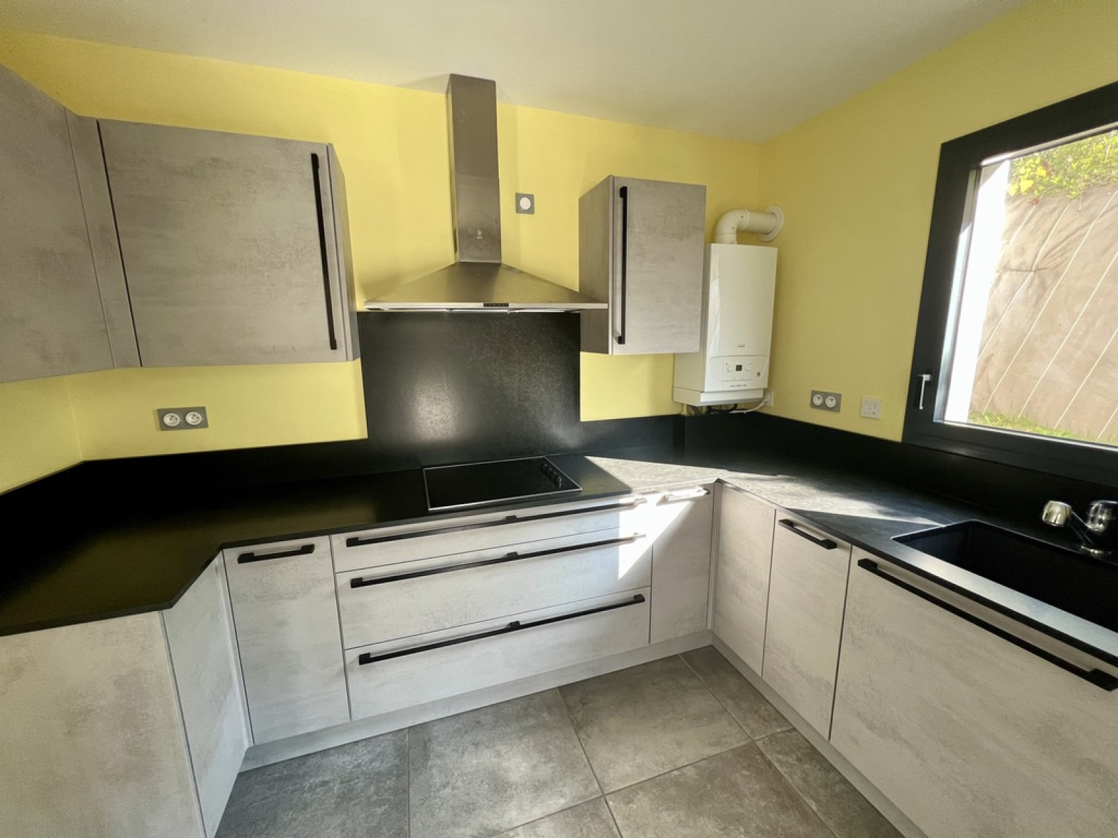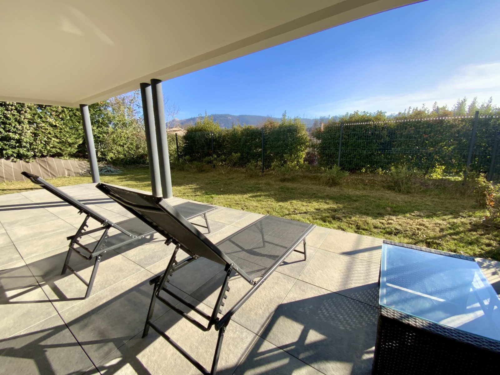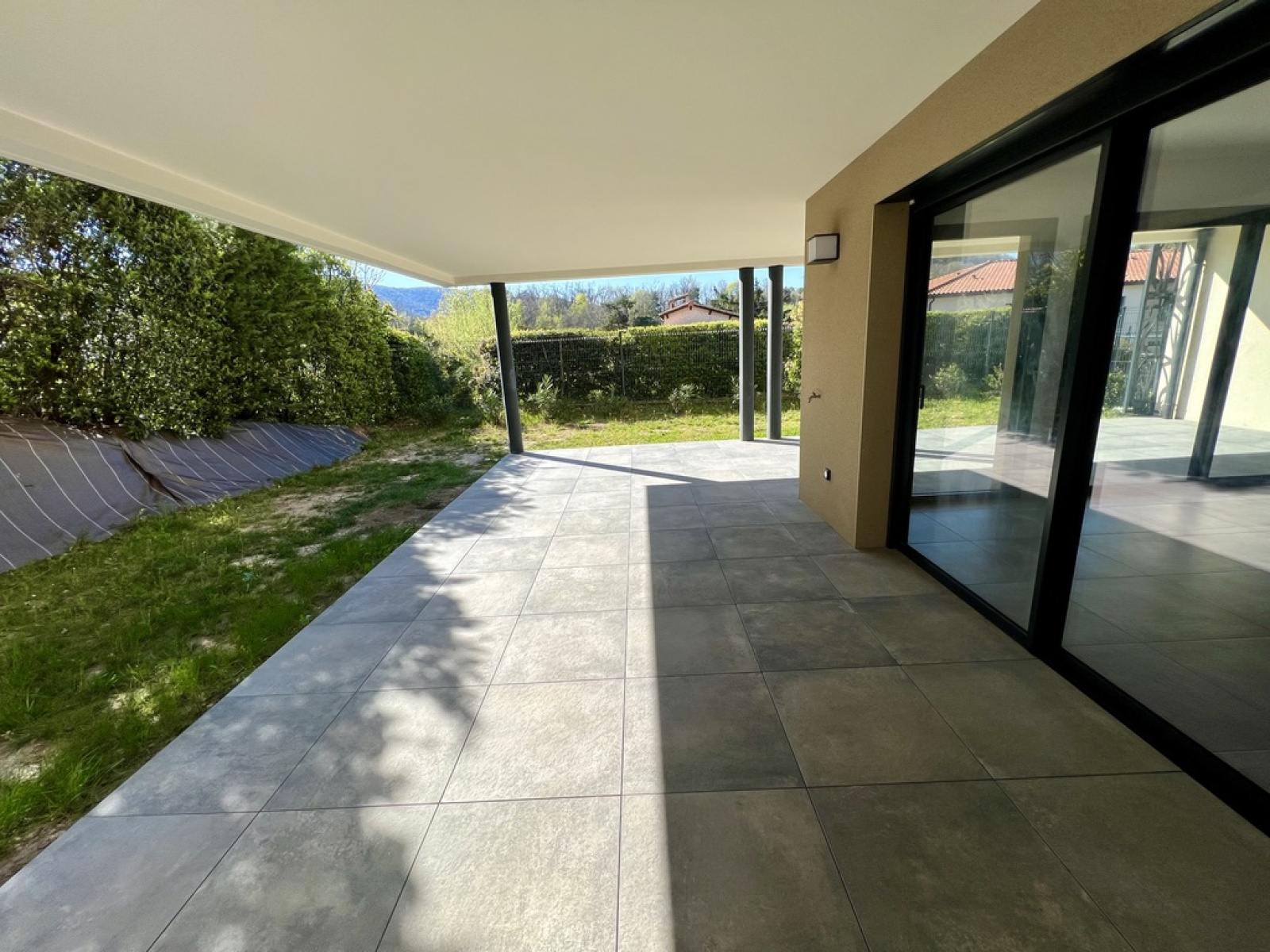 La pièce de vie accueille une cuisine intégrée, fonctionnelle et équipée, ouverte sur un vaste salon d’environ 35 m², baigné de lumière naturelle. Les larges ouvertures donnent directement accès à une terrasse couverte d’environ 40 m² prolongée par un jardin clôturé, offrant un véritable espace de vie supplémentaire au quotidien.