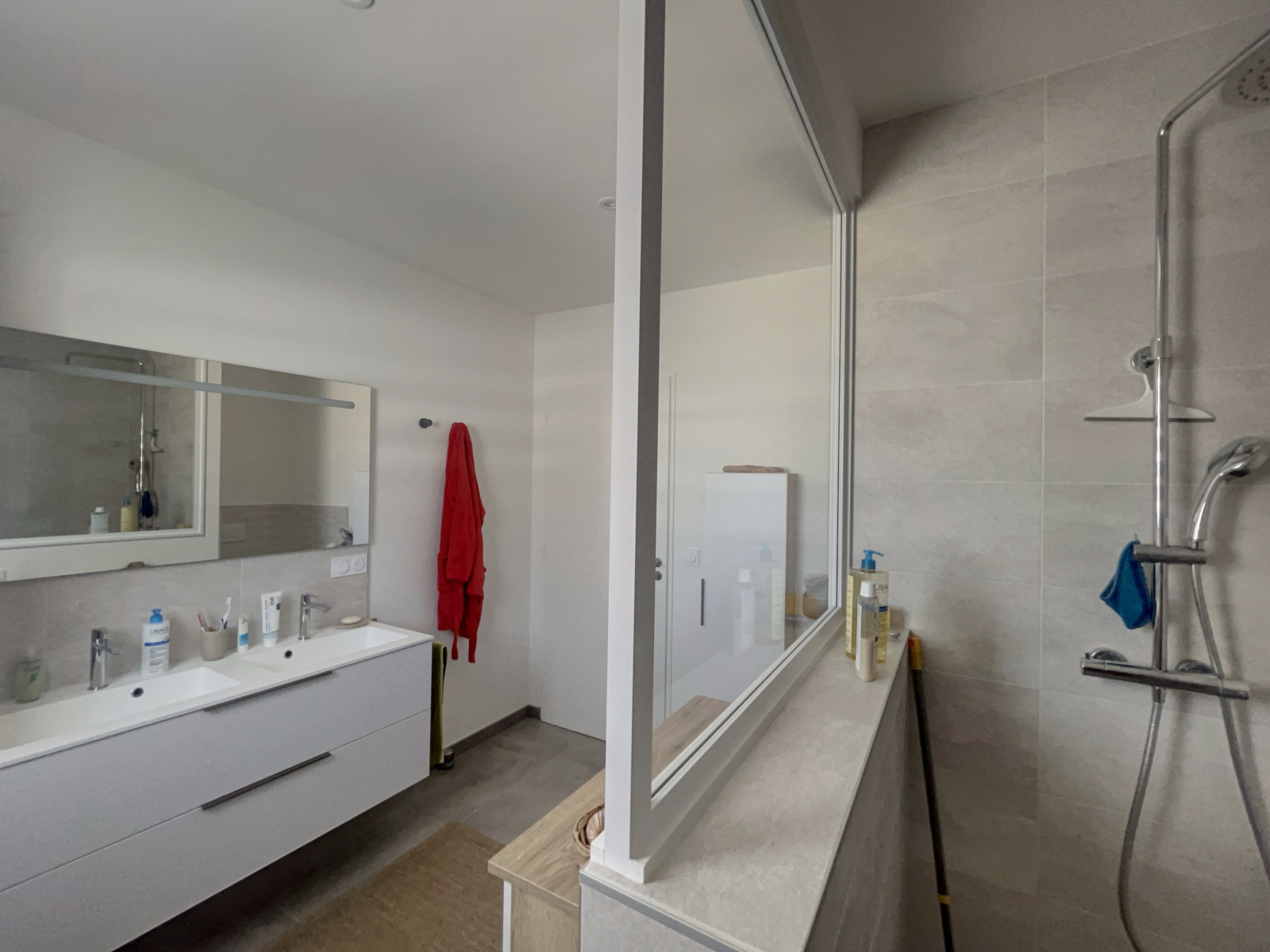 Côté nuit, le rez-de-chaussée dispose d’une belle chambre d’environ 14 m² avec son dressing attenant d’environ 9 m², d’une grande salle d’eau d’environ 9 m² et d’un WC indépendant.