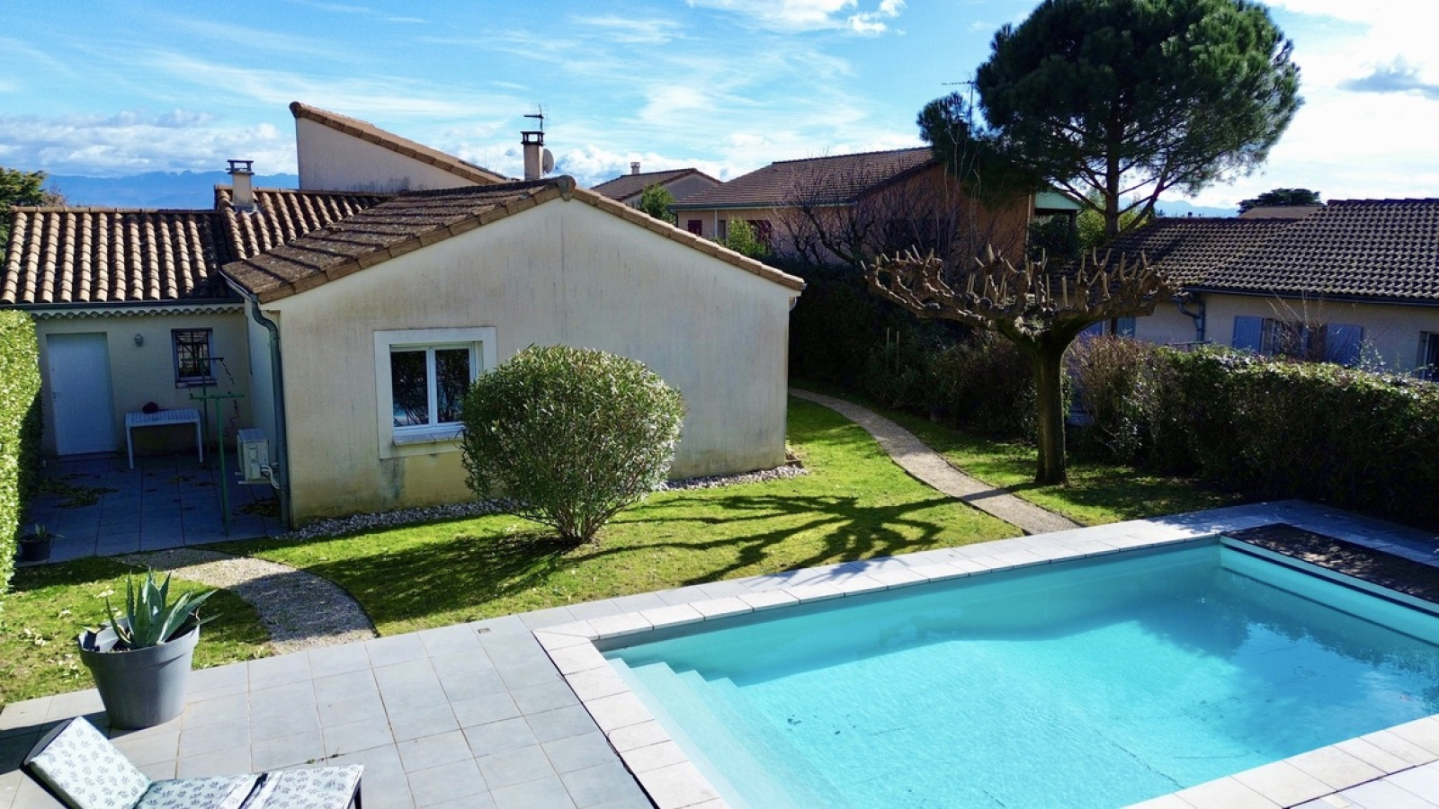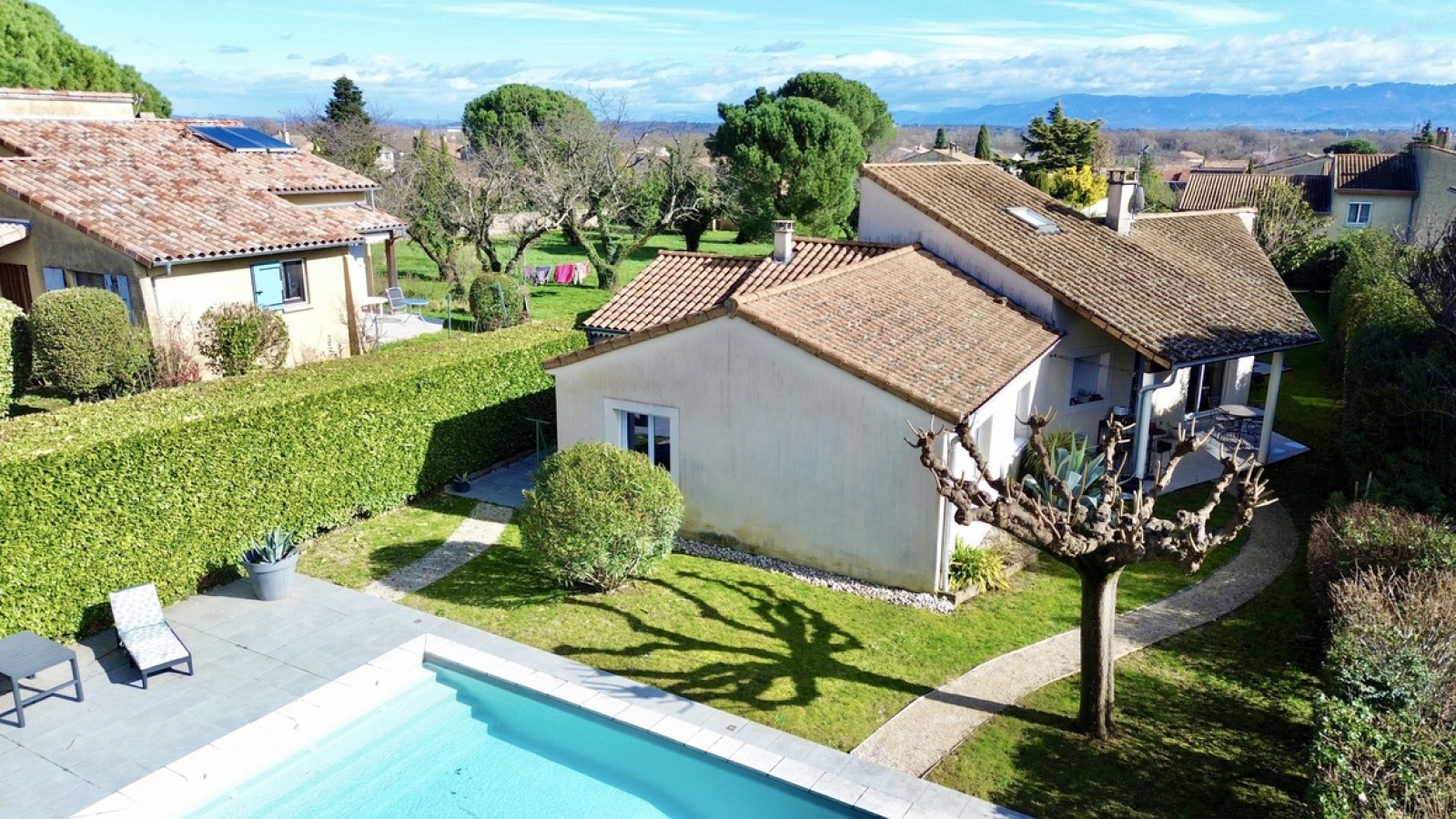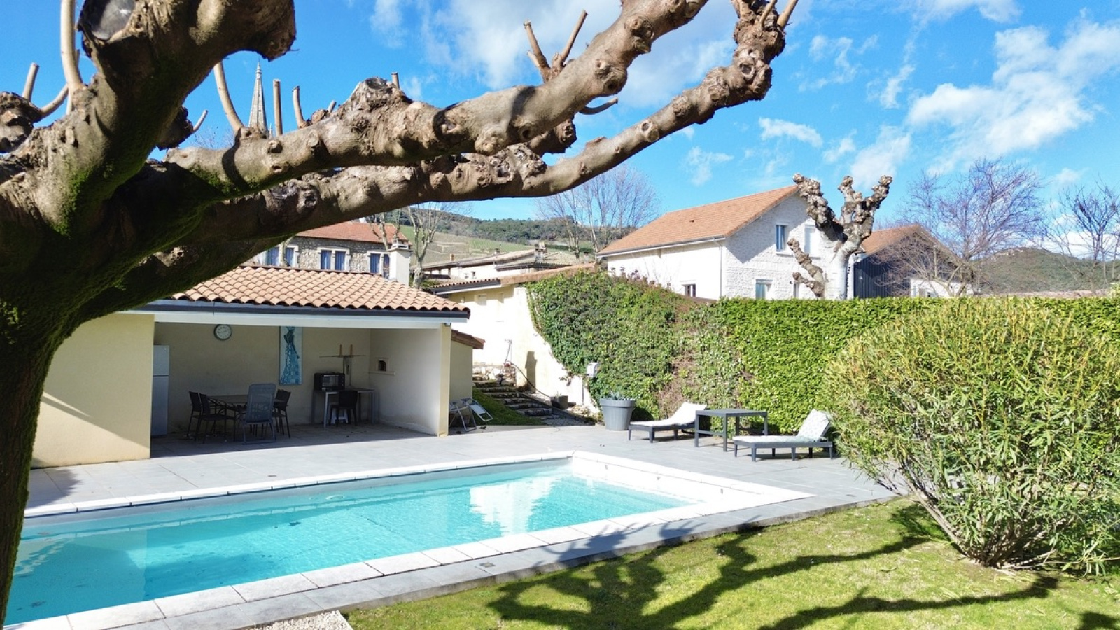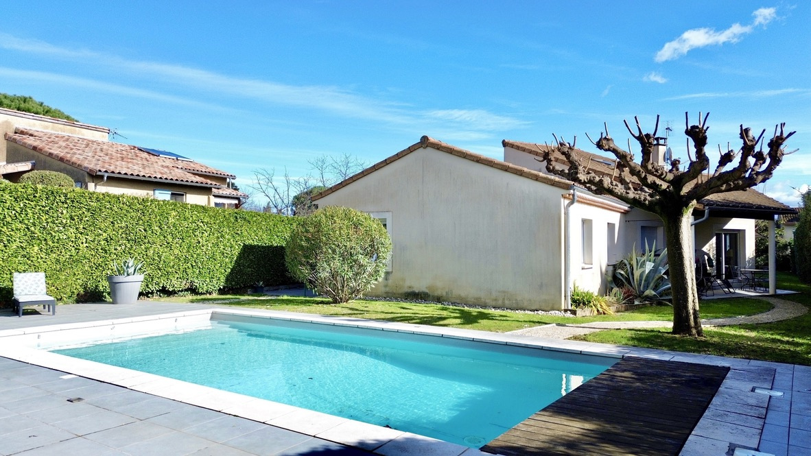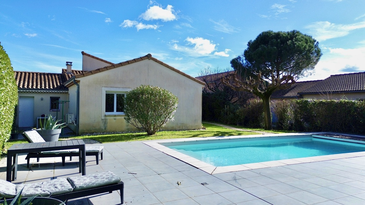À l’extérieur, le jardin est entretenu et dispose d'une piscine avec son pool house ainsi que plusieurs espaces terrasse. Depuis l’espace piscine, vous profitez d’une vue laissant apparaître le clocher de Cornas, apportant un véritable charme à l’ensemble.