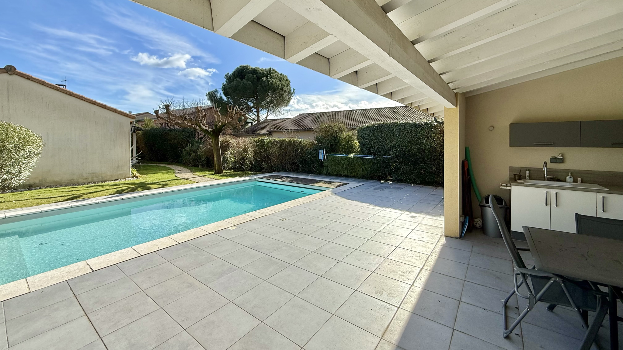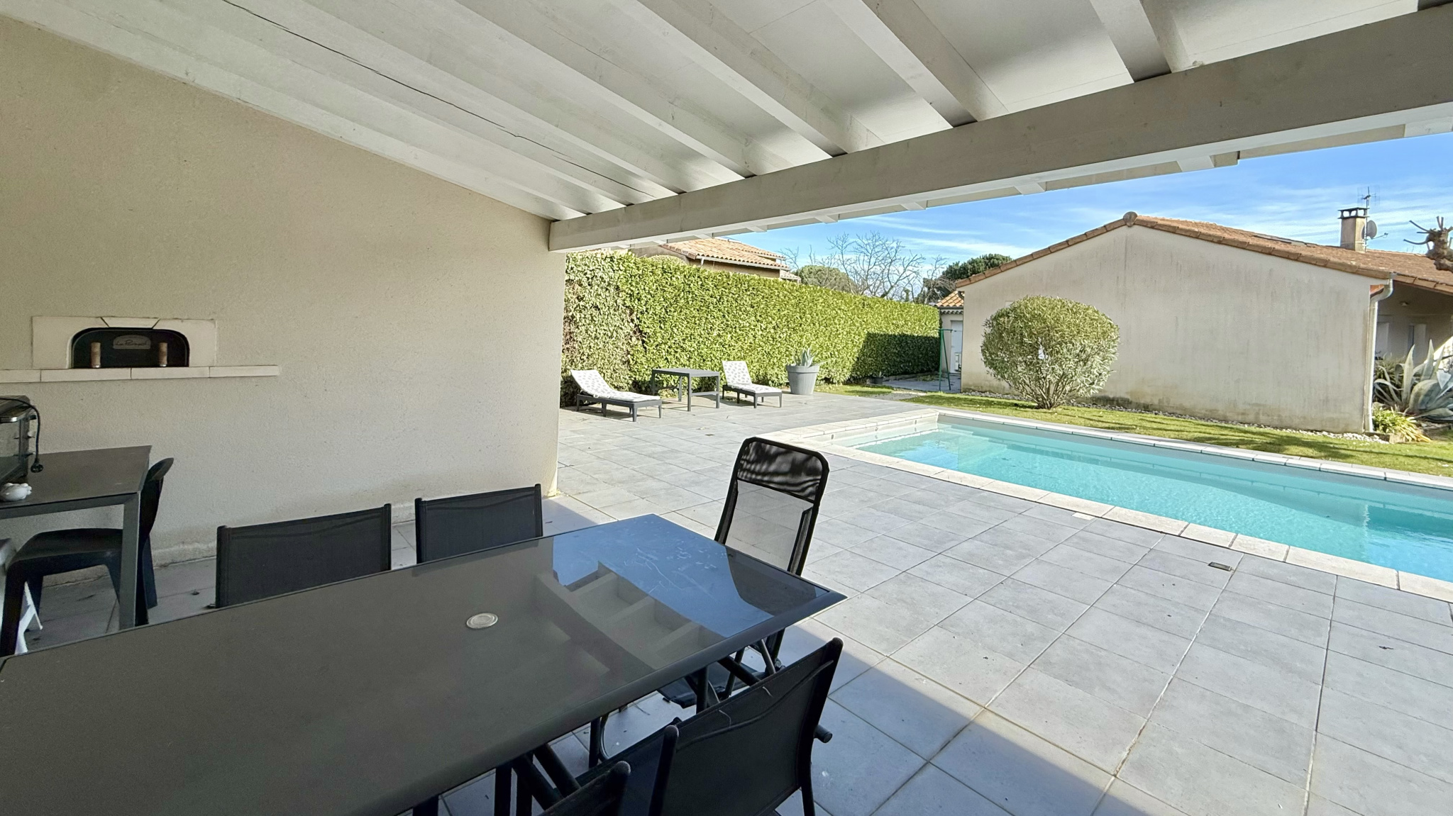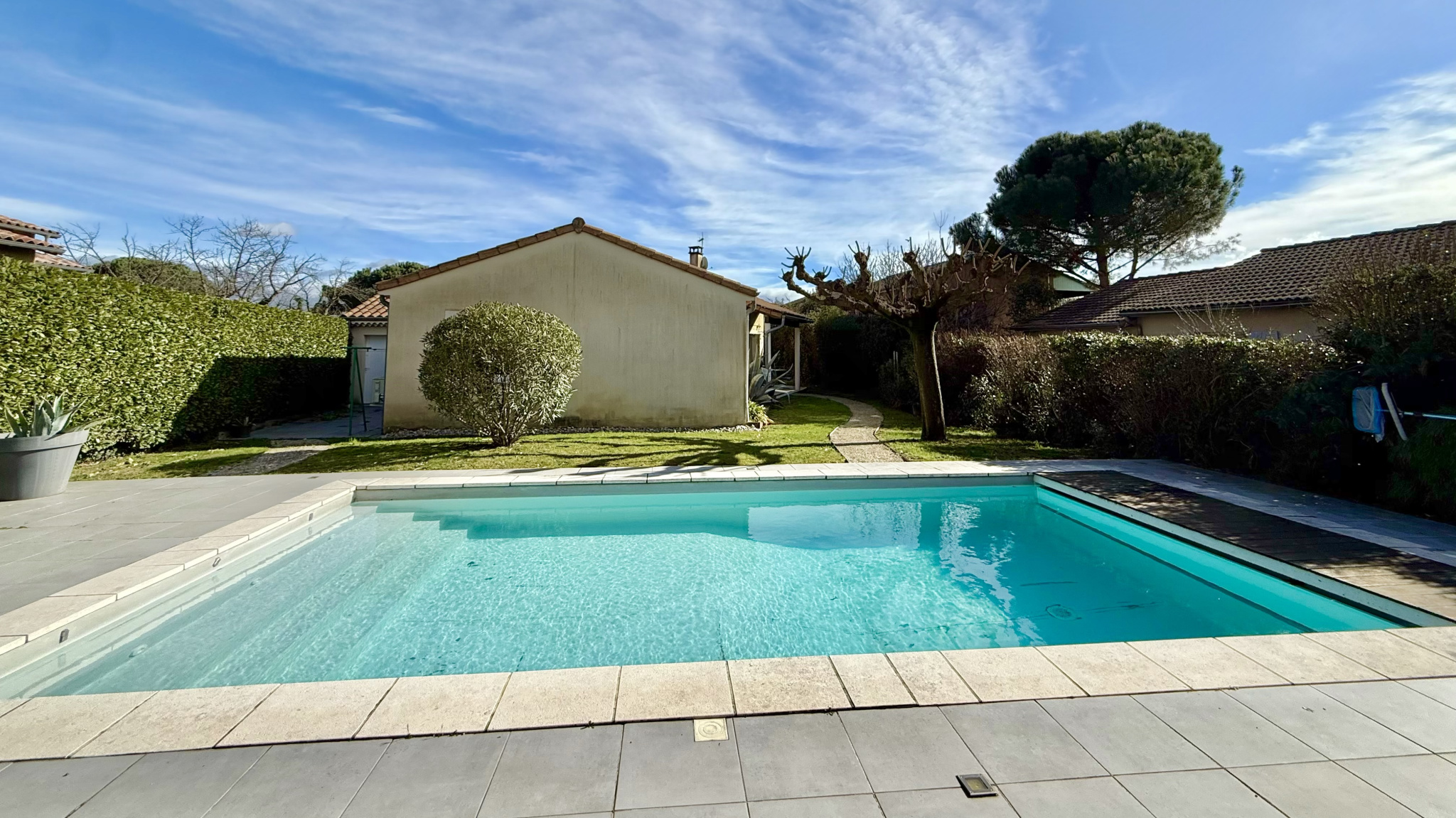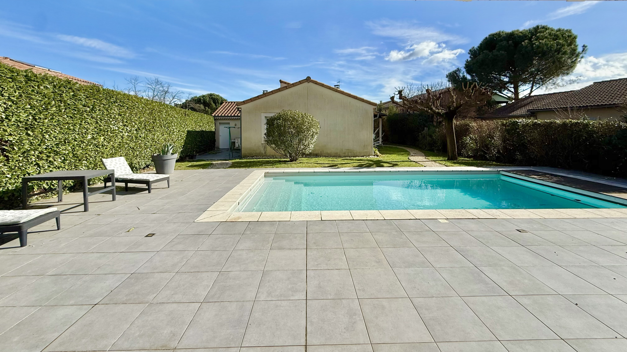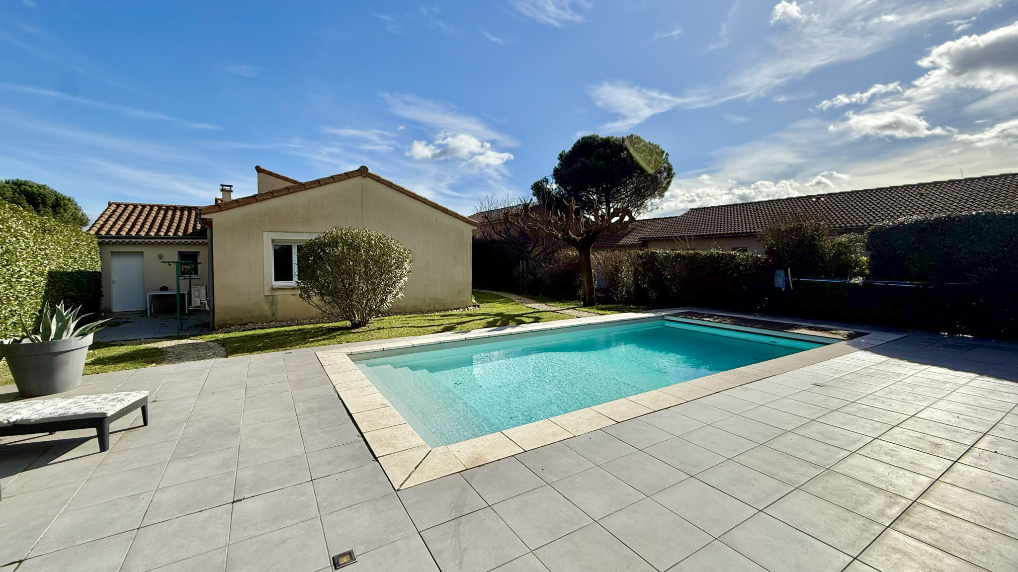 À l’extérieur, le jardin est entretenu et dispose d'une piscine avec son pool house ainsi que plusieurs espaces terrasse. Depuis l’espace piscine, vous profitez d’une vue laissant apparaître le clocher de Cornas, apportant un véritable charme à l’ensemble.