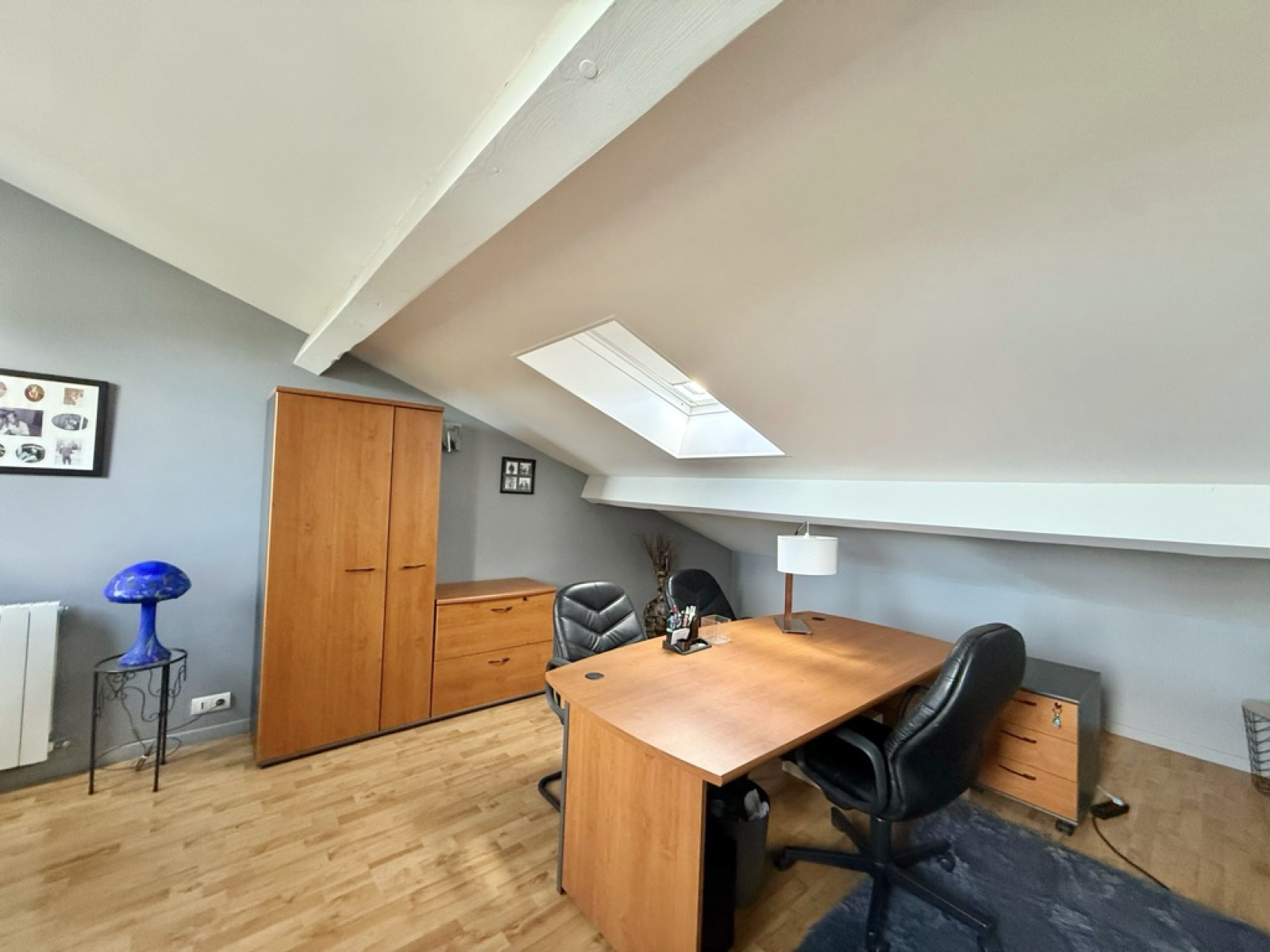 À l’étage, une mezzanine fait actuellement office de bureau mais peut parfaitement convenir comme chambre d’appoint ou espace invités.