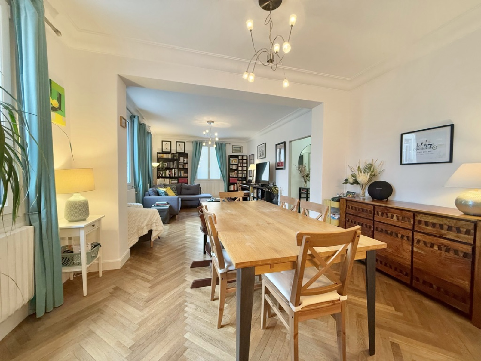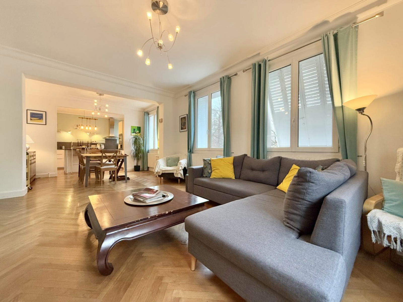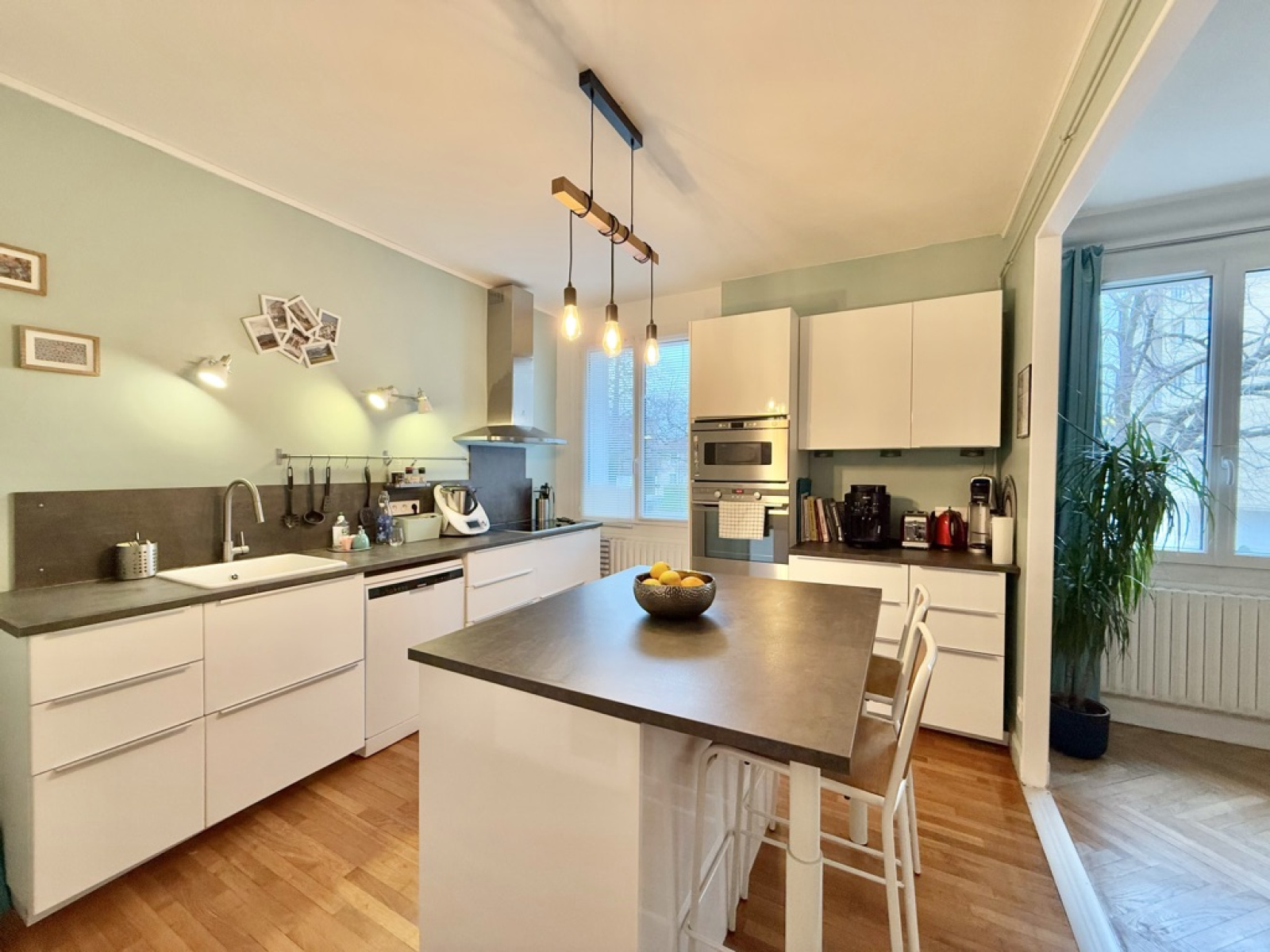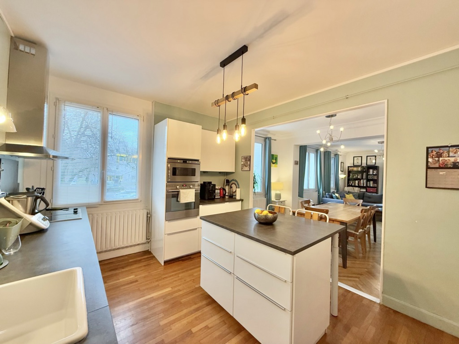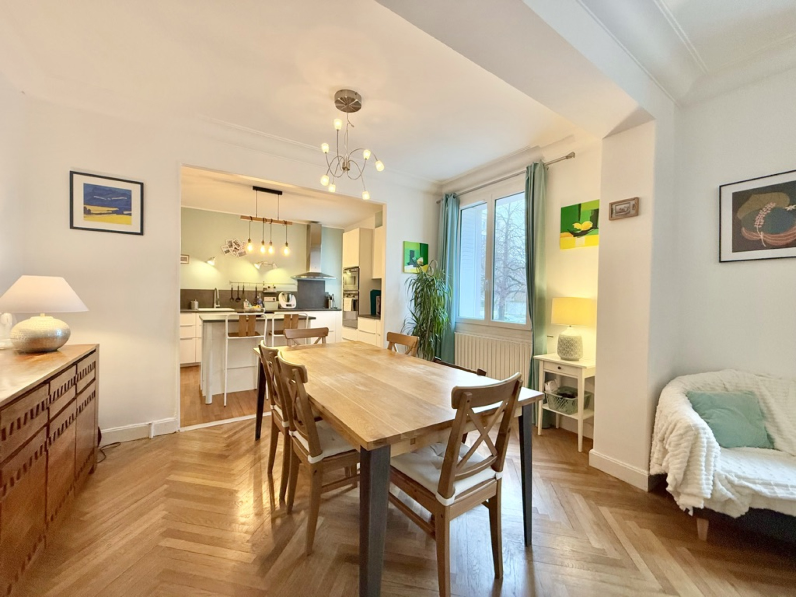 L’appartement s’ouvre sur un salon / salle à manger spacieux, où un parquet apporte du caractère à l'espace de vie. La cuisine ouverte avec îlot central prolonge harmonieusement cet espace, offrant un cadre convivial.