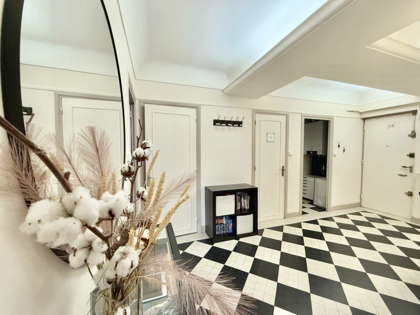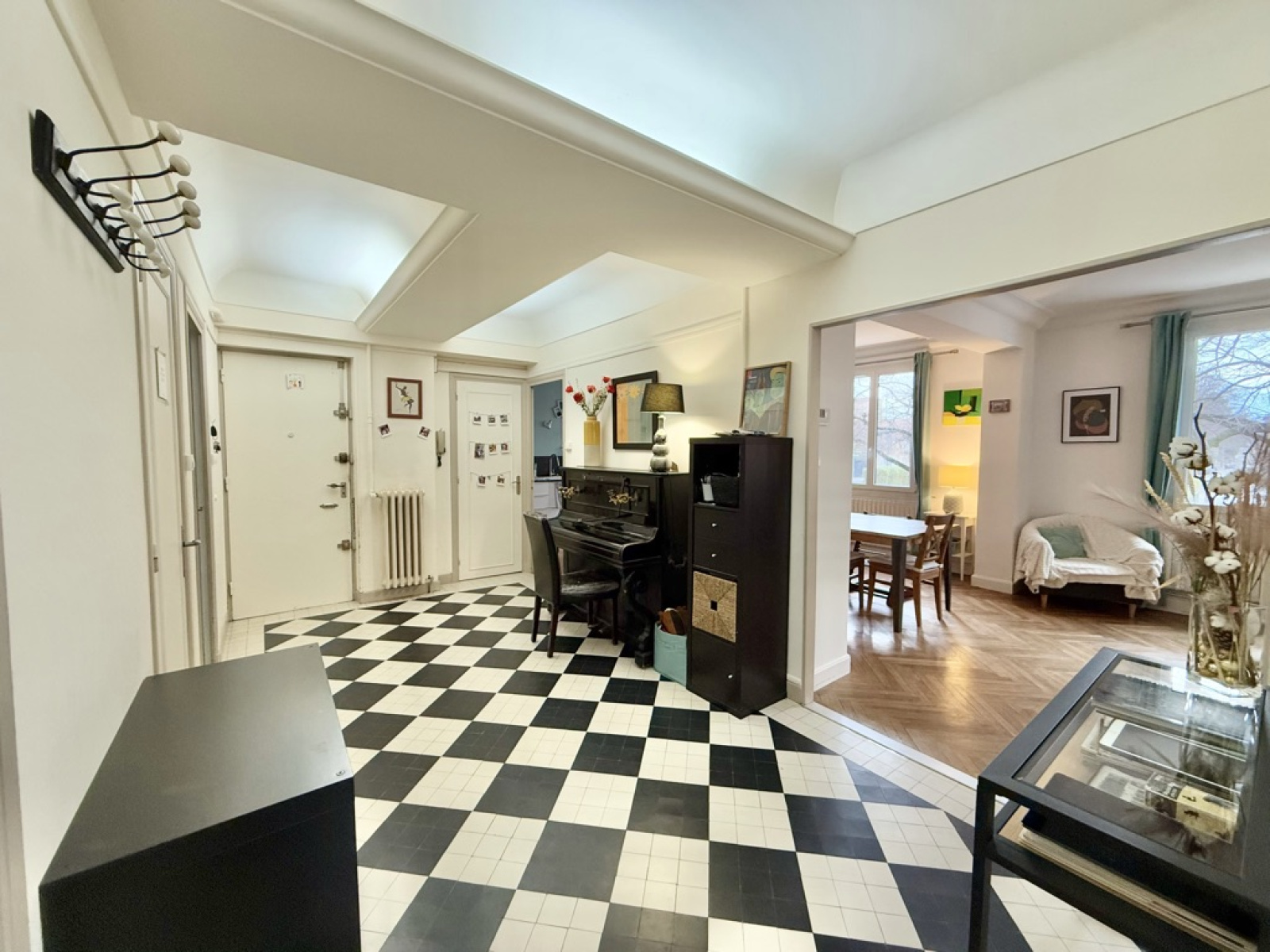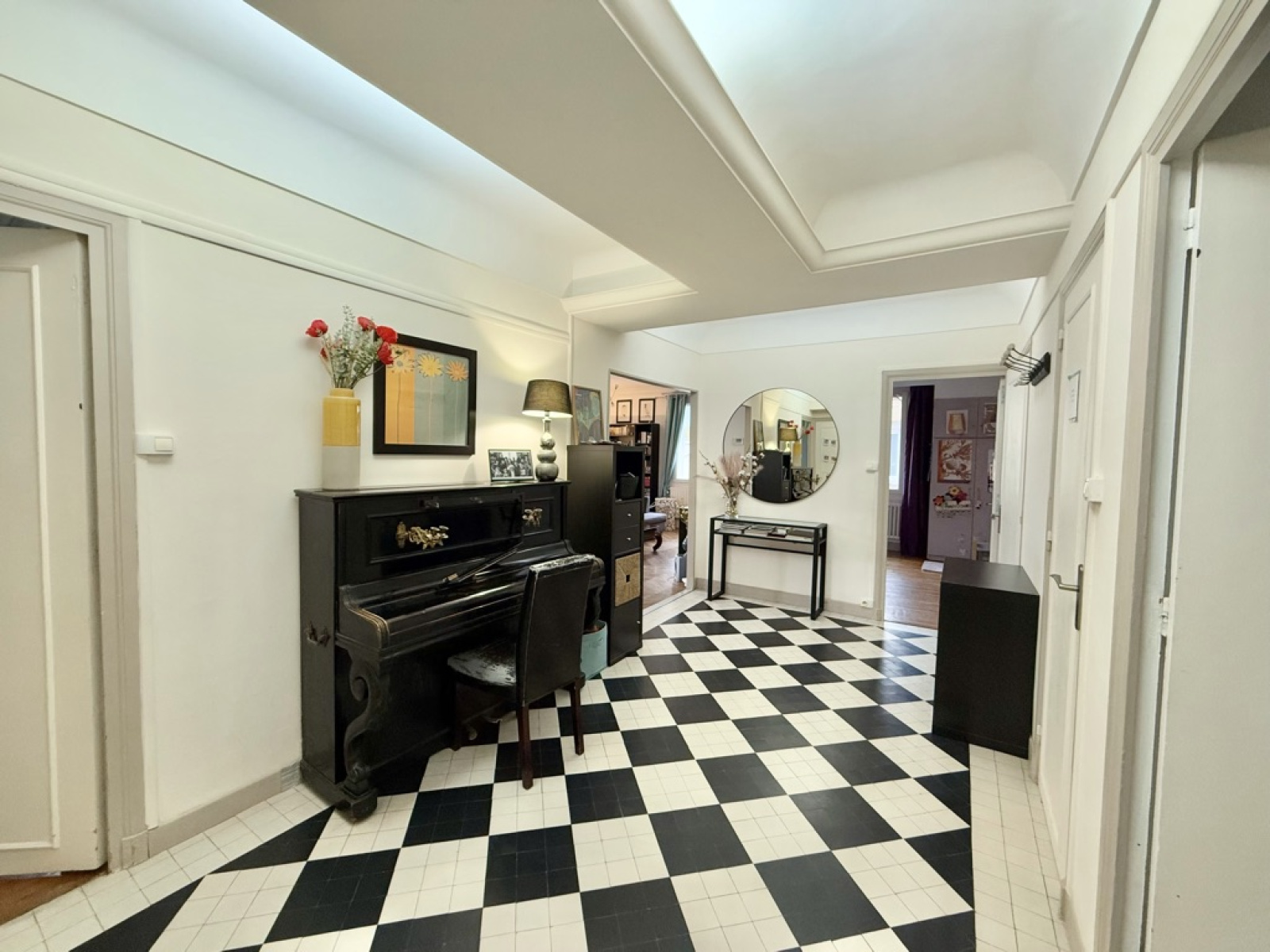 Dès l’entrée, vous serez séduit par son hall au cachet indéniable, sublimé par un sol noir et blanc élégant et un plafond Art déco qui accentue le charme de l’espace.