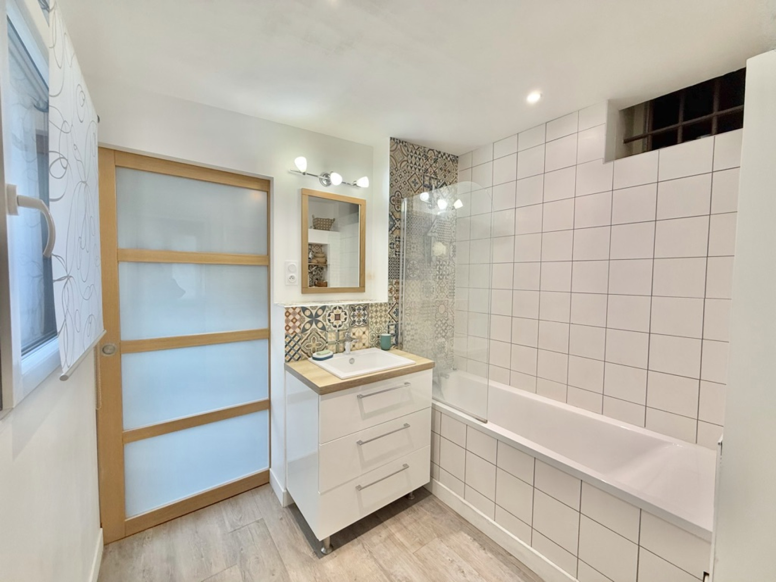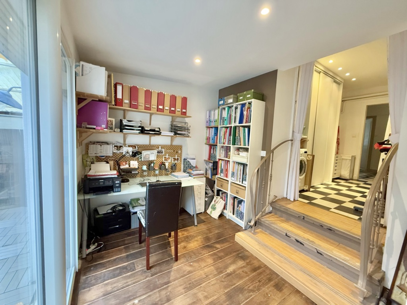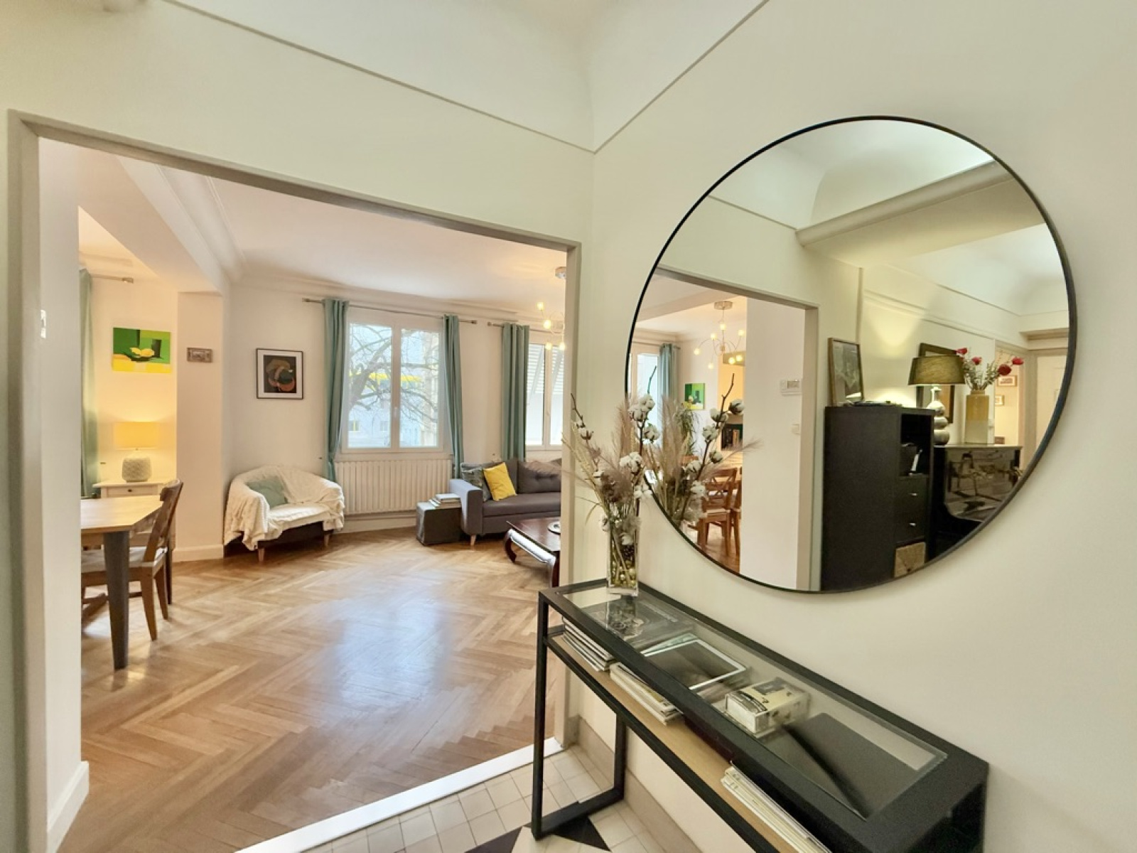 Dès l’entrée, vous serez séduit par son hall au cachet indéniable, sublimé par un sol noir et blanc élégant et un plafond Art déco qui accentue le charme de l’espace.