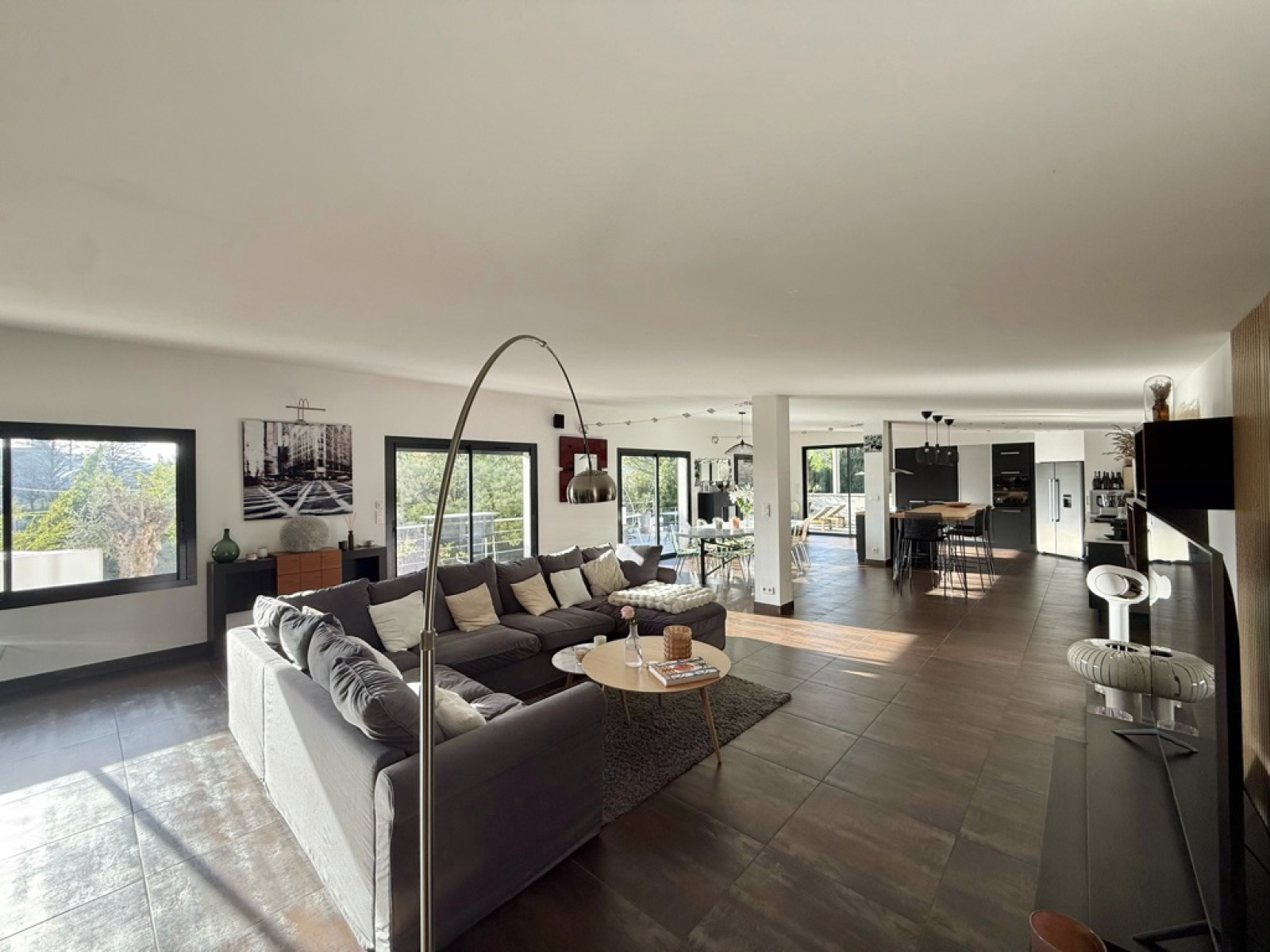 Implanté au premier étage, ce loft s’articule autour d’un vaste espace de vie d’environ 115 m², réunissant salon, salle à manger et cuisine ouverte. Entièrement baigné de lumière grâce à de nombreuses baies vitrées, cette pièce bénéficie d’une exposition plein sud avec de belles ouvertures sur l’extérieur.