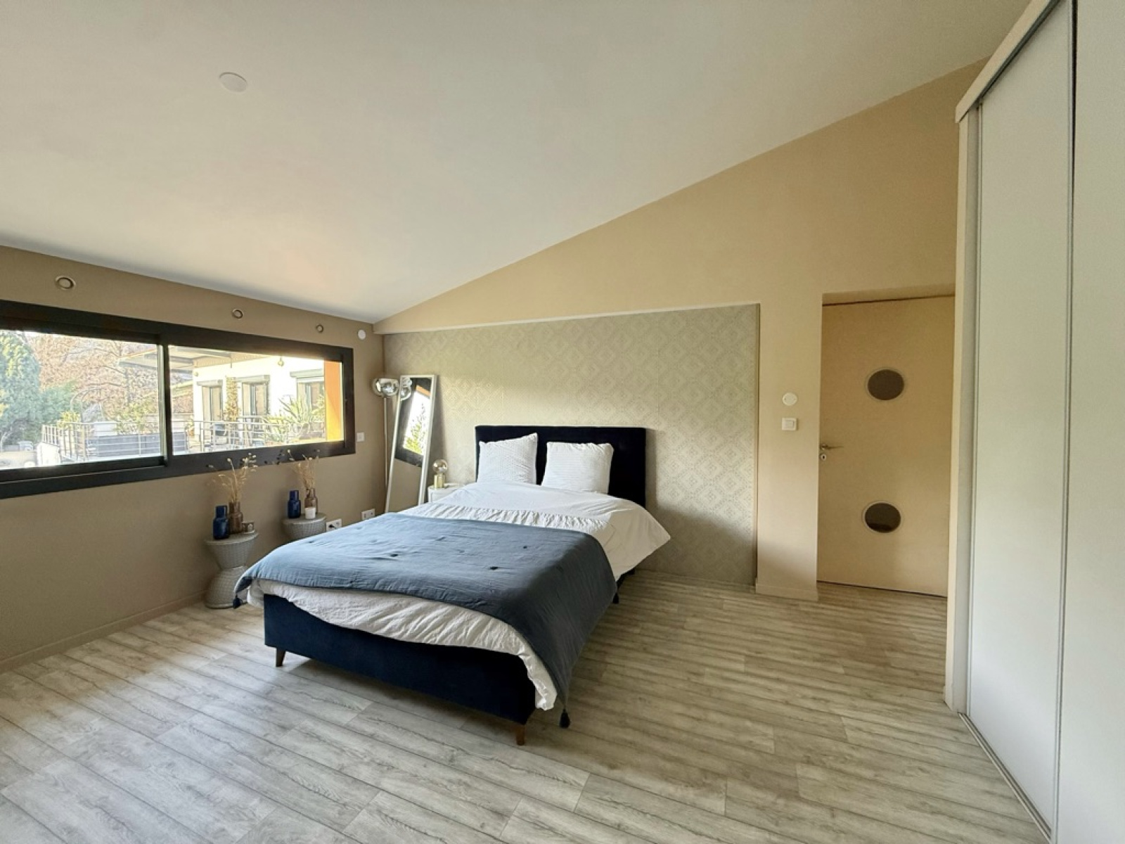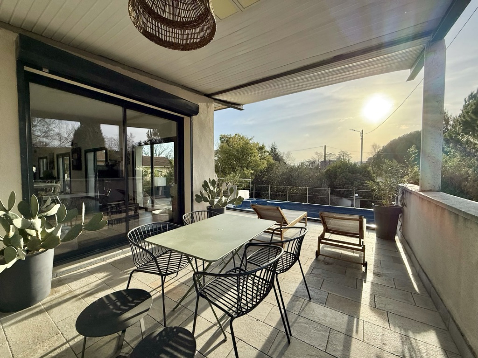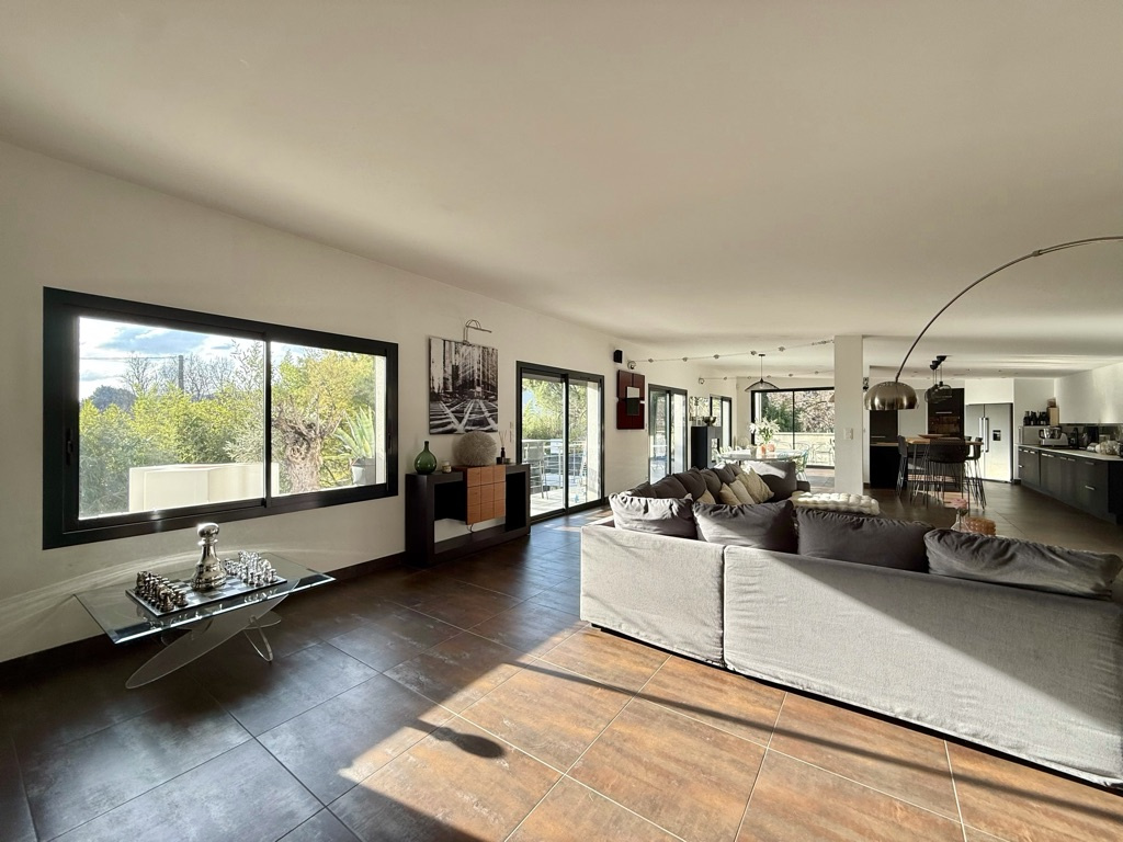 Cet espace se prolonge sur une grande terrasse d’environ 90 m², véritable atout du loft, intégrant une piscine coque.