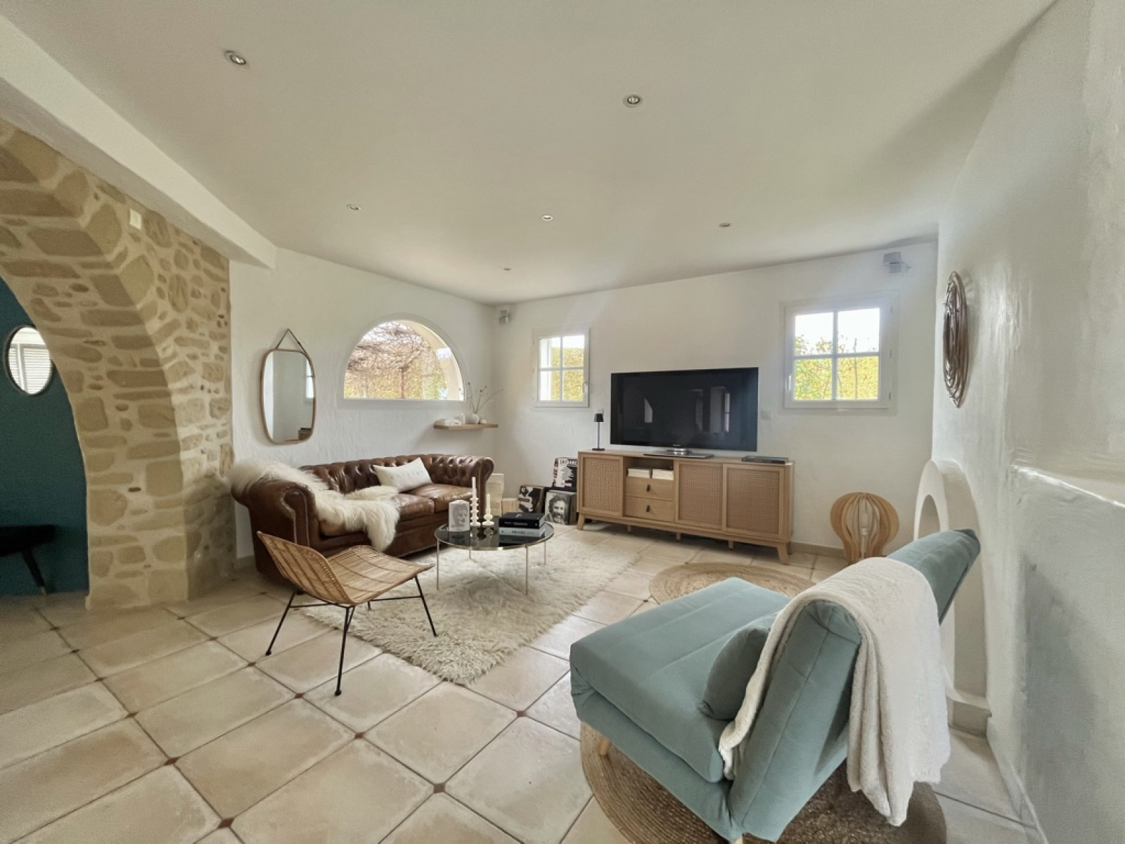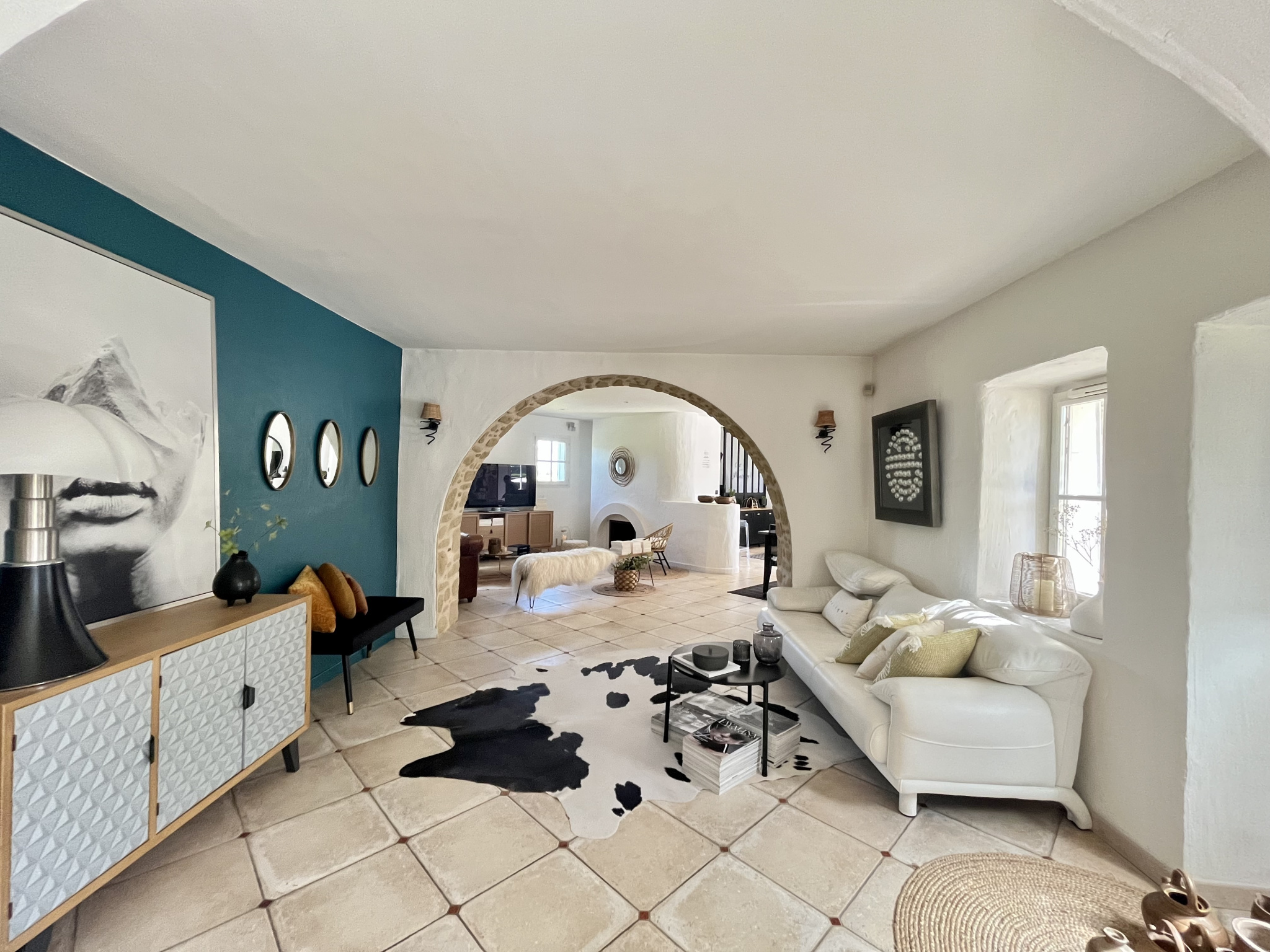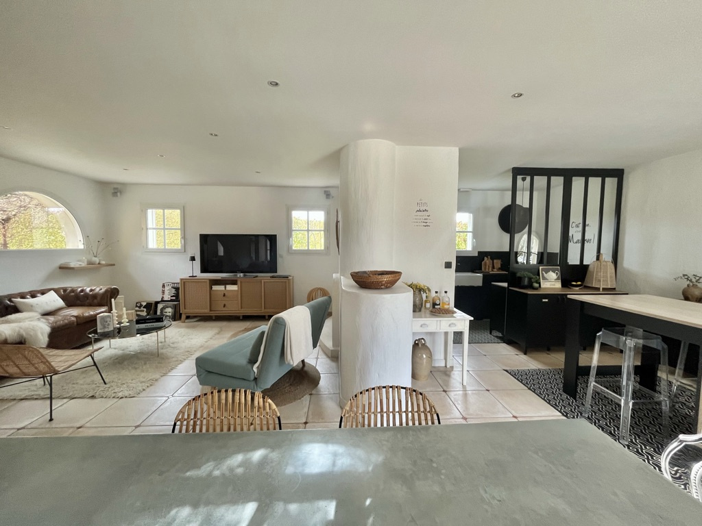 Cette villa séduit par ses beaux volumes et ses espaces cosy. On y découvre d’abord un grand hall d’entrée qui distribue une belle pièce de vie, composée d’un premier salon aux magnifiques voûtes en pierre, apportant une touche de caractère, puis d’un second salon avec cheminée et une cuisine ouverte, agrémentée d’une verrière et d’un îlot central.