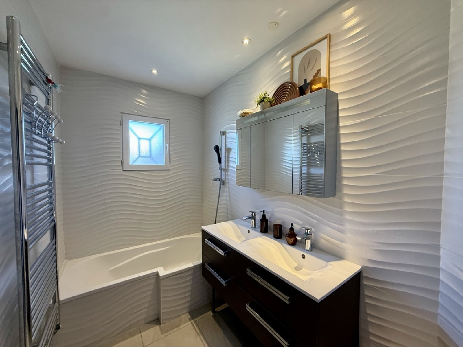 Le rez-de-chaussée propose un espace nuit parfaitement distinct comprenant trois chambres avec placards intégrés, une salle de bain avec double vasque et baignoire, un WC indépendant ainsi qu’une buanderie.