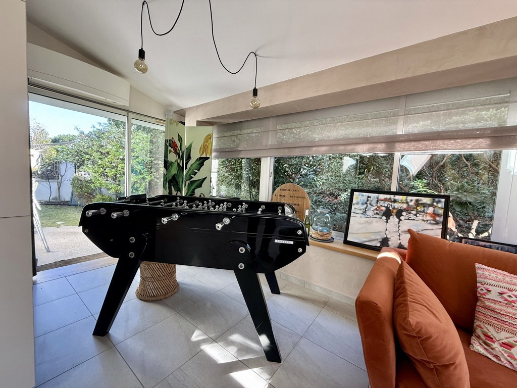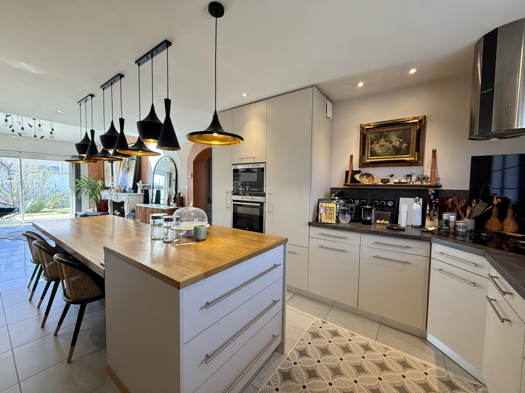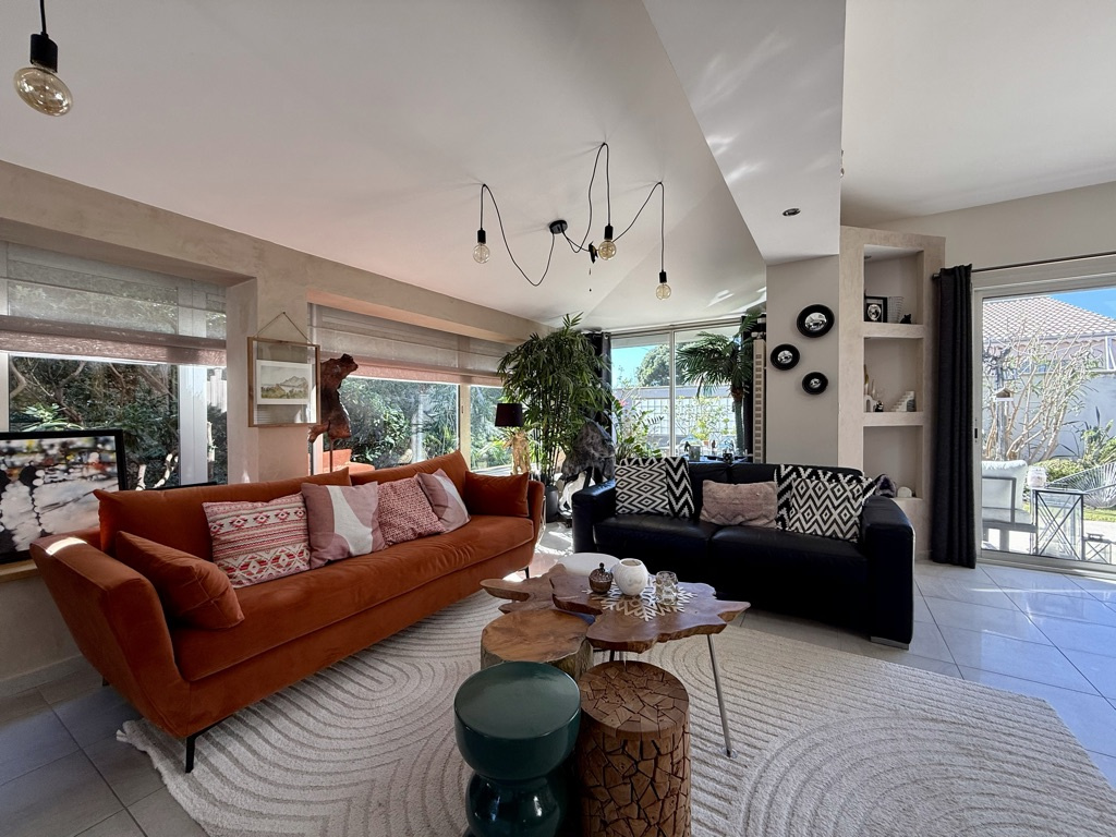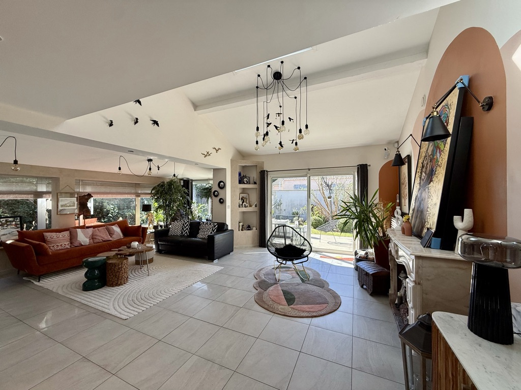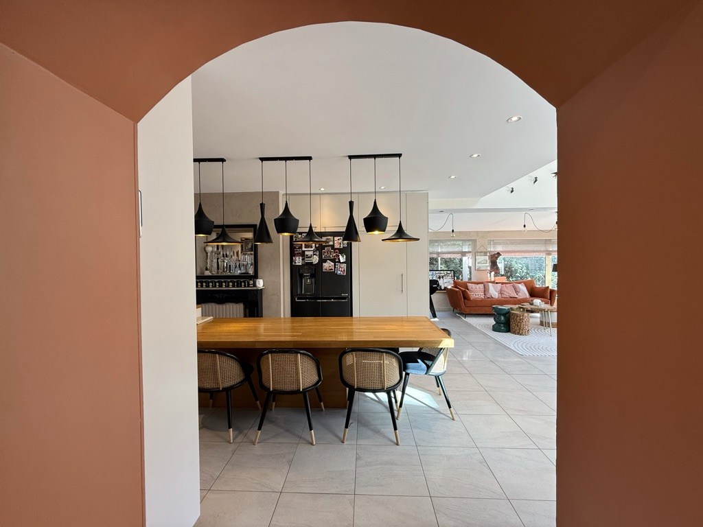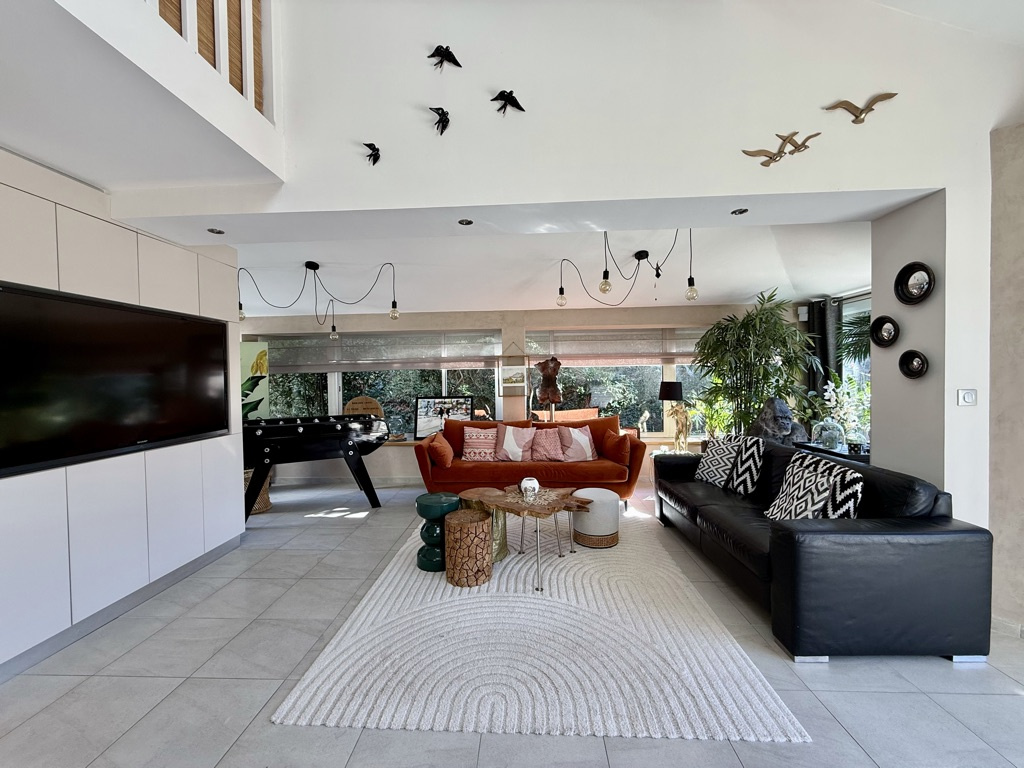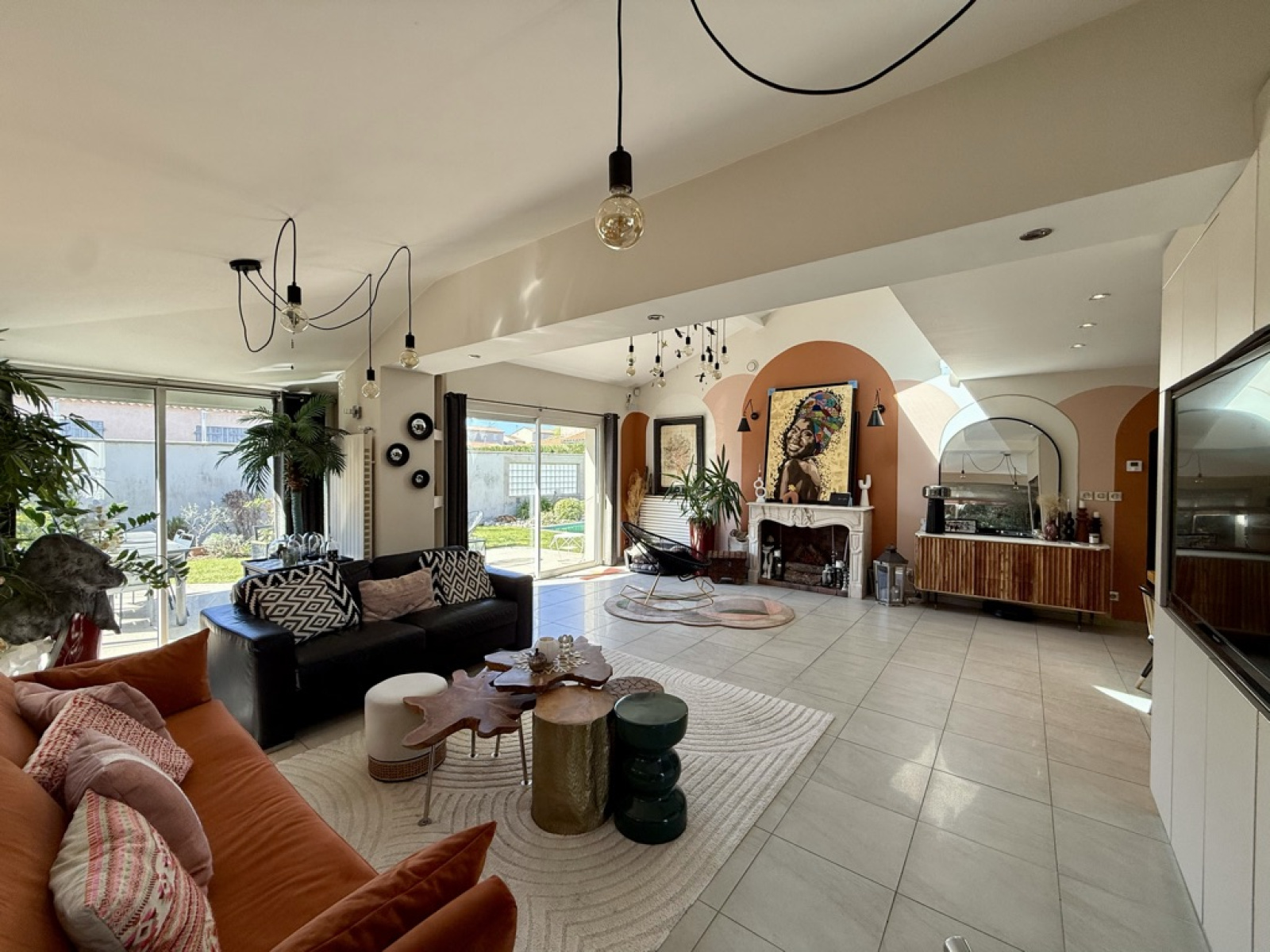 La pièce de vie principale de plus de 60 m² bénéficie d’une triple exposition, d’une belle hauteur sous plafond et d’un grand velux, lui apportant une luminosité exceptionnelle tout au long de la journée. Elle se compose d’un espace salon spacieux, d’une cuisine entièrement équipée avec son grand îlot central et son espace repas convivial. Les nombreuses baies vitrées prolongent naturellement la pièce de vie vers la terrasse et l’espace piscine.