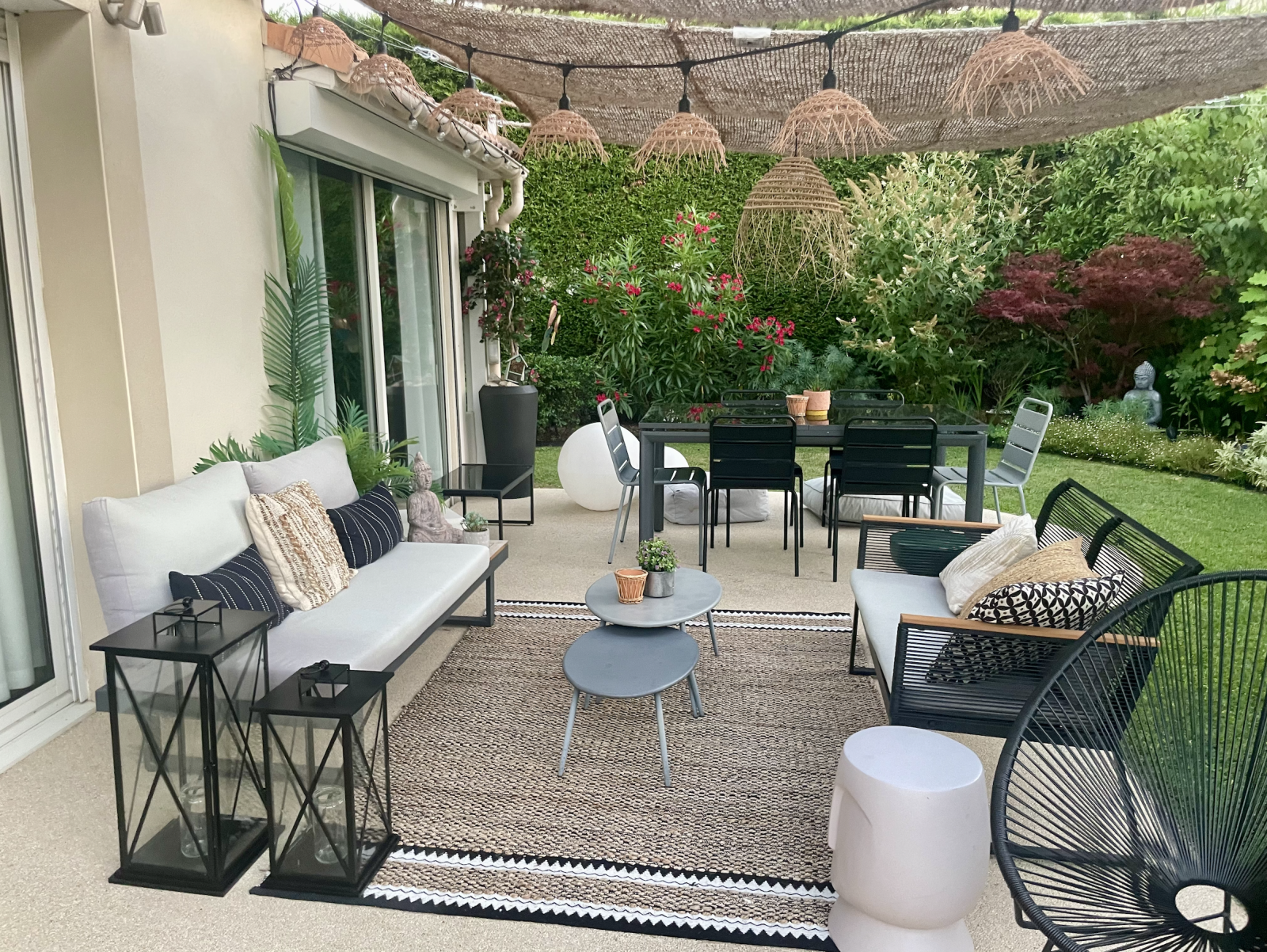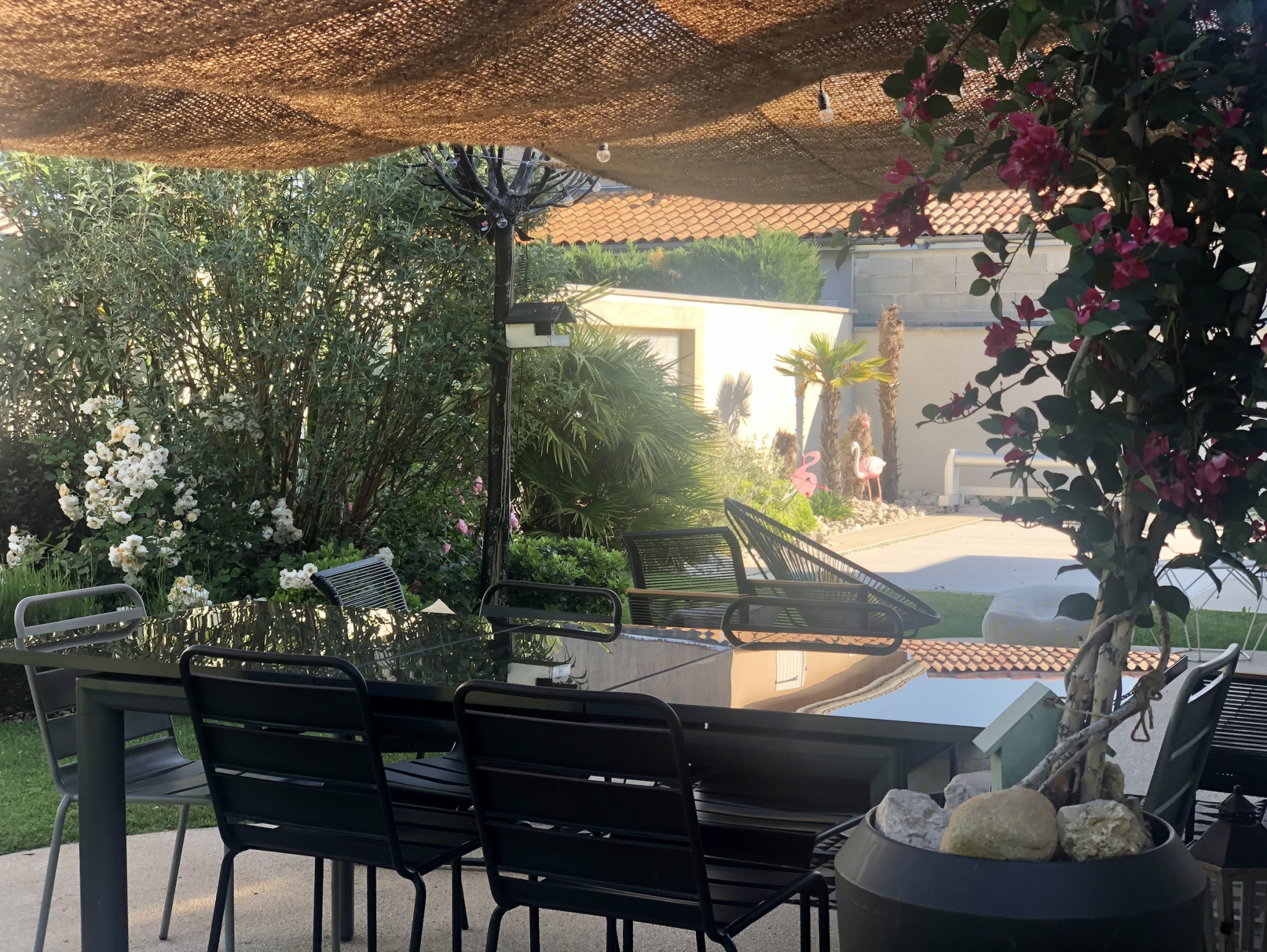 À l’extérieur, tout a été pensé pour profiter pleinement des beaux jours : terrasse spacieuse, jardin paysagé facile d’entretien, piscine chauffée de 5,50 x 3 m avec rideau solaire électrique, sans oublier un environnement entièrement clos et intimiste.